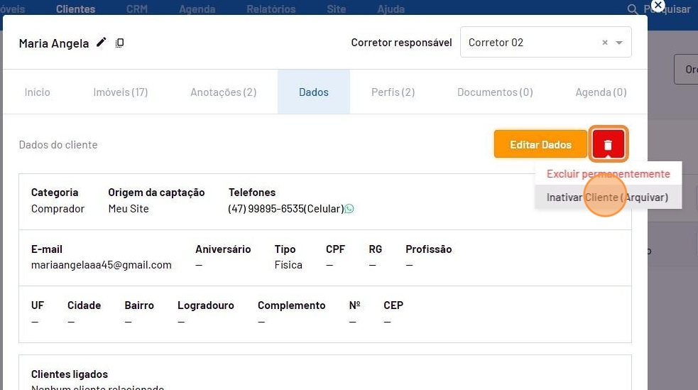 - Vá até o ícone de lixeira vermelho e clique em "Inativar Cliente (Arquivar)".