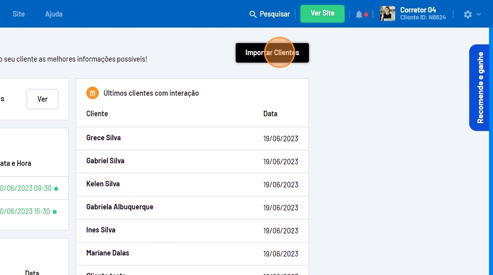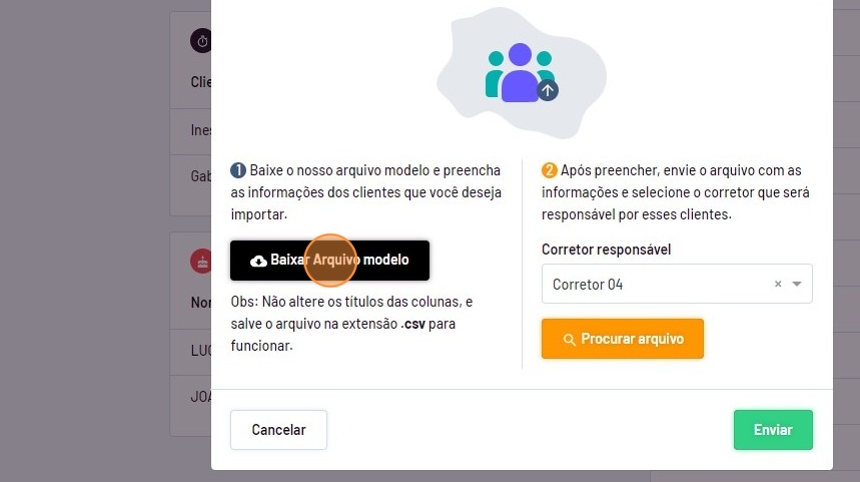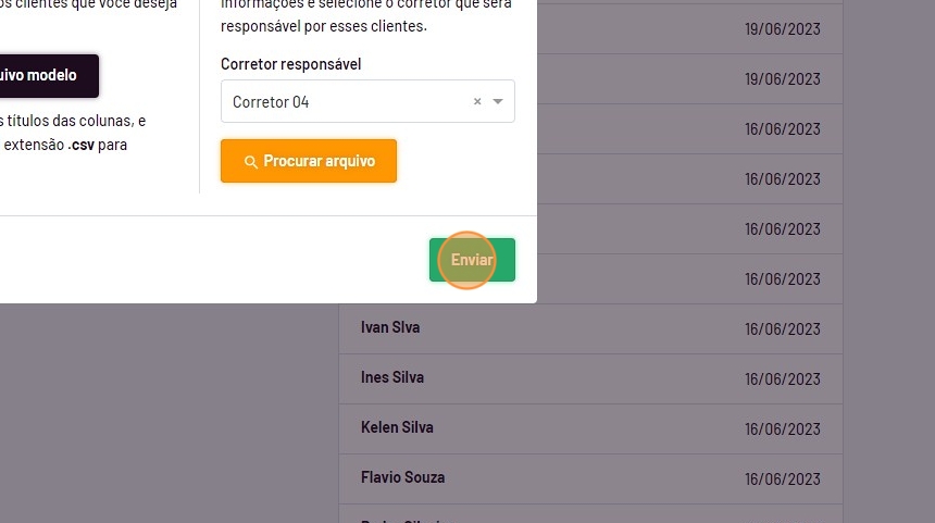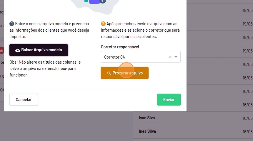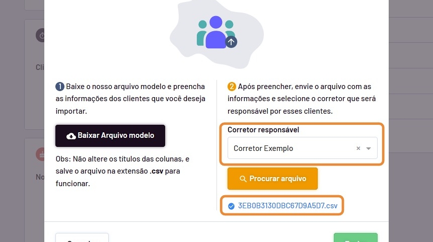 - Selecione o "Corretor responsável" pelos clientes que serão importados.