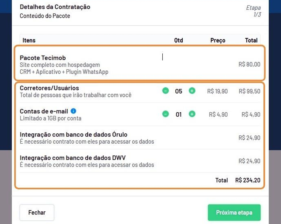 Abaixo você verá que possui itens adicionais para seu plano, como a inclusão de usuários ou corretores, contas de e-mail, integração com Órulo e DWV.