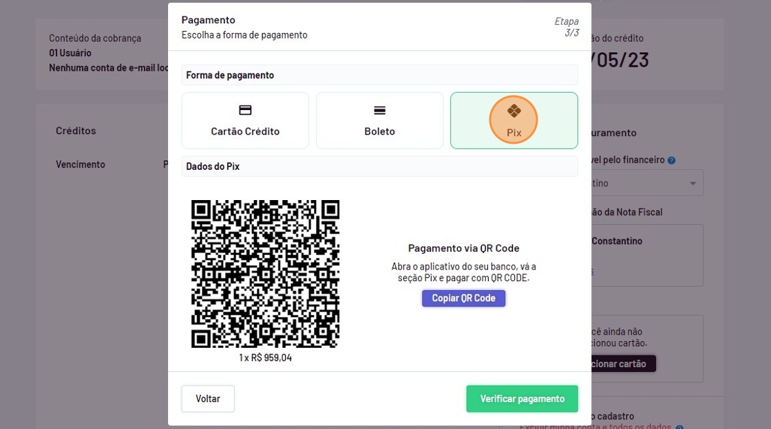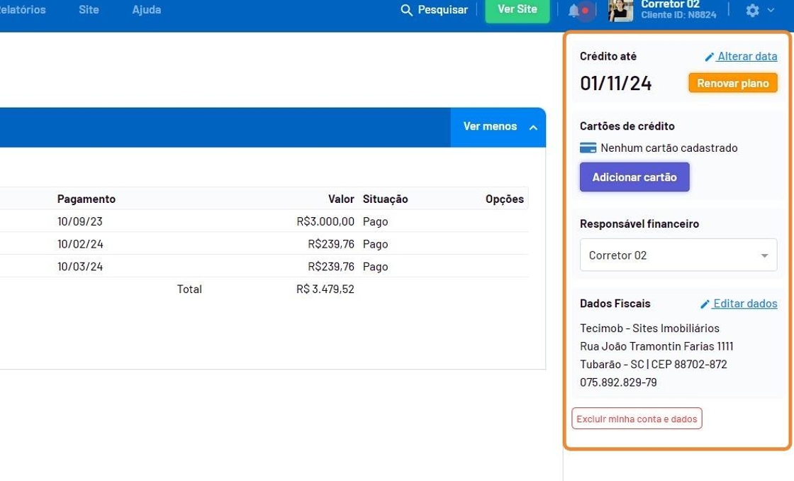 - Na lateral direita ficará a duração de créditos, a opção para renovar o plano, dados do cartão de crédito (se possuir), o usuário responsável pelo financeiro e os dados fiscais.