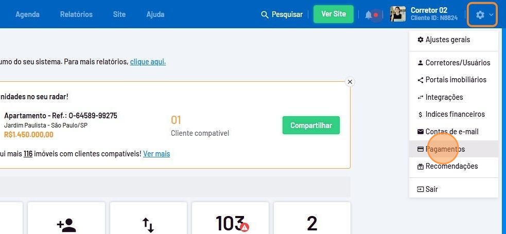 - Passe o mouse sobre a engrenagem no canto superior direito da sua tela e clique em "Pagamentos".