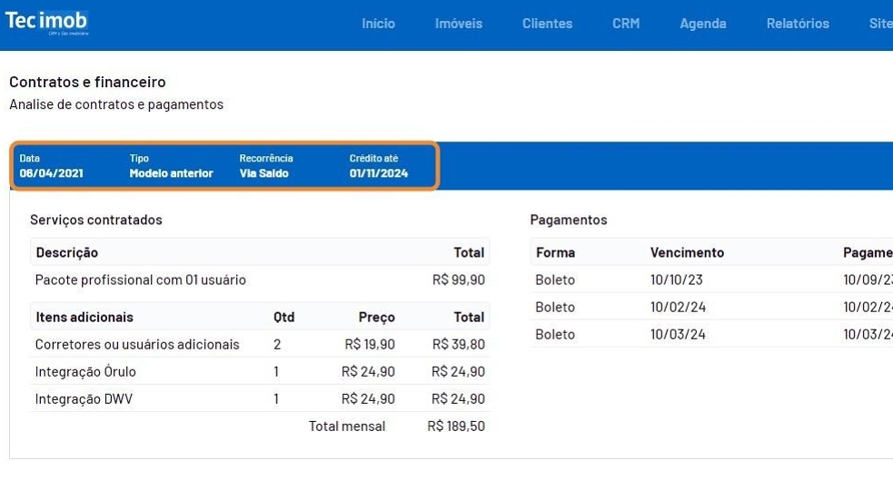 - Na área do Financeiro é possível visualizar seus contratos, com a data da contratação, o tipo de contrato, a recorrência e o período de créditos que você possui.