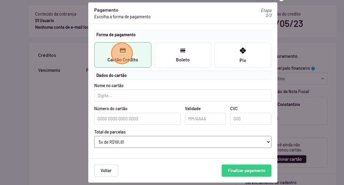 - Escolhe entre cartão de crédito.