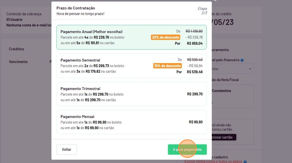 - Escolha qual o período do plano e clique em "Ir para pagamento".