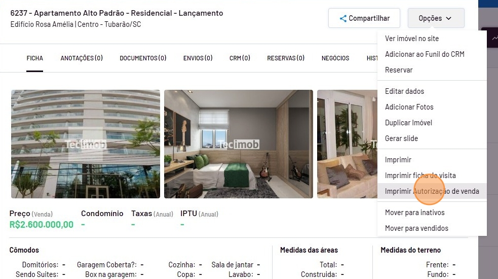 - Após encontrar o imóvel desejado, clique sobre ele e passe o mouse em "Opções". Nas opções, clique em "Imprimir Autorização de venda".