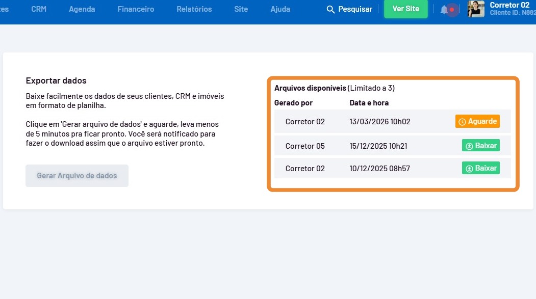 - Selecione quais dados deseja incluir no arquivo e clique em "Gerar Arquivo de dados" para baixar os dados selecionados em formato de planilha (xls).