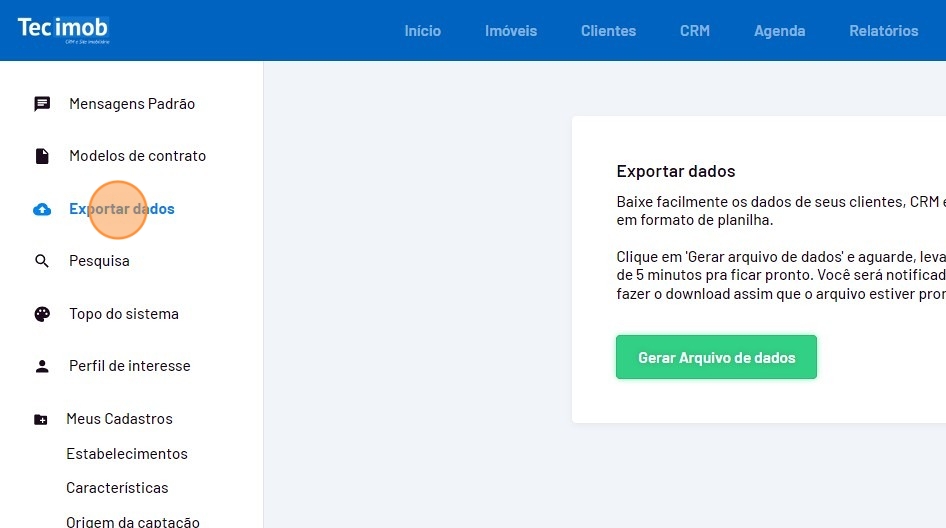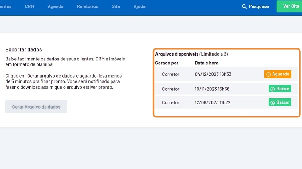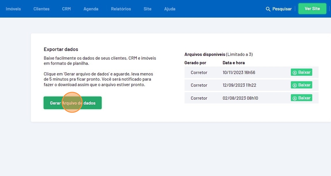 - Clique em "Gerar Arquivo de dados" para baixar os dados dos seus clientes, CRM e imóveis em formato de planilha (xls).