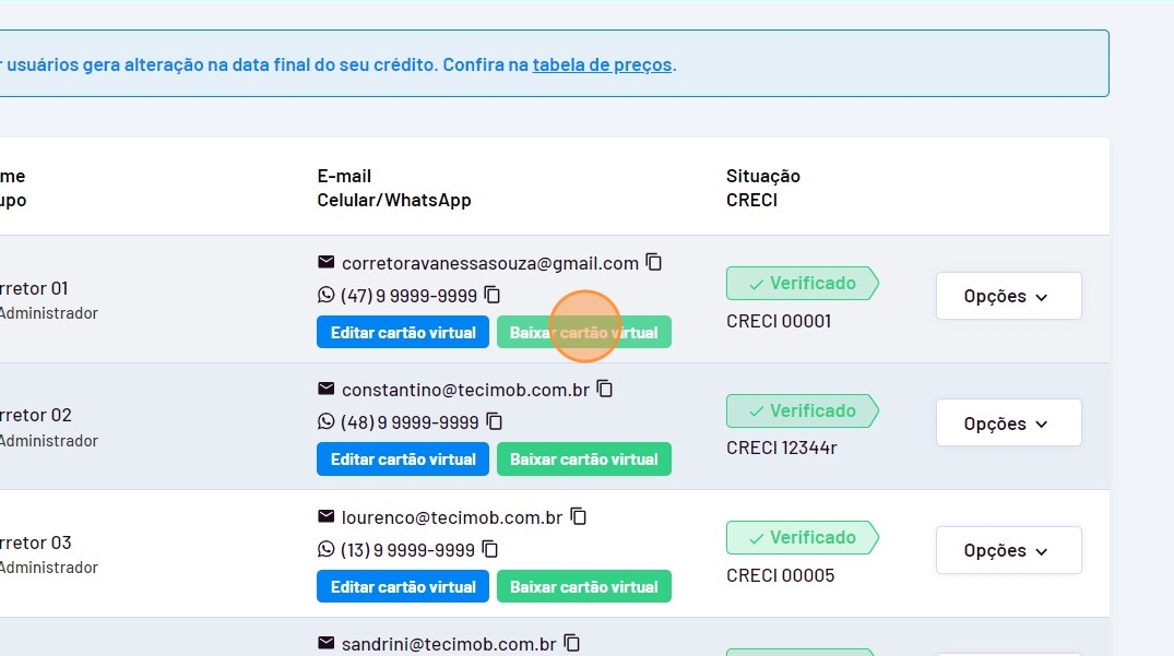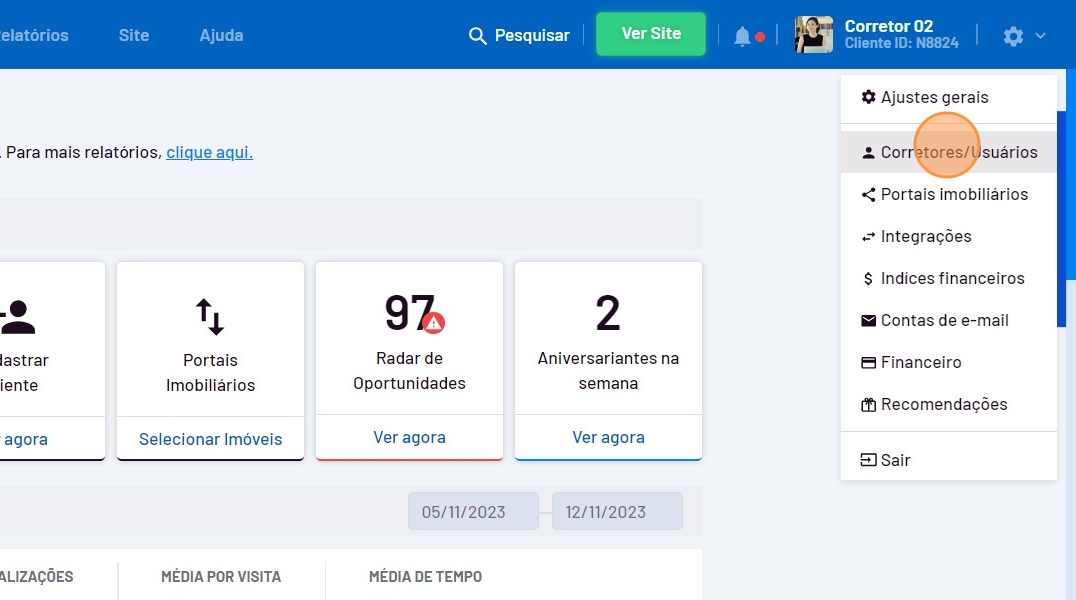 - Vá até a engrenagem no canto superior direito da tela e clique em "Corretores/Usuários".