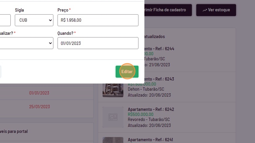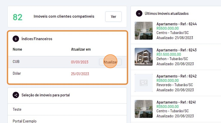 Para atualizar índices financeiros como o CUB e moedas estrangeiras, siga estes passos: