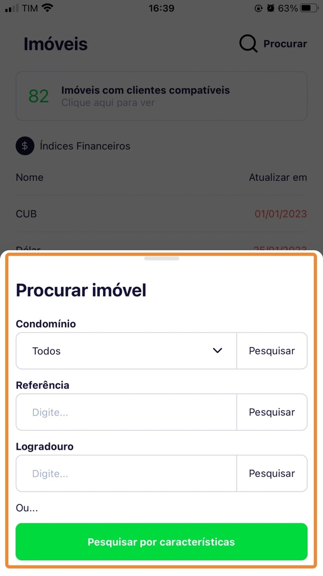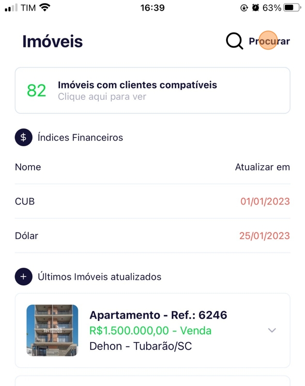 Para pesquisar seus imóveis no aplicativo Tecimob, siga estes passos: