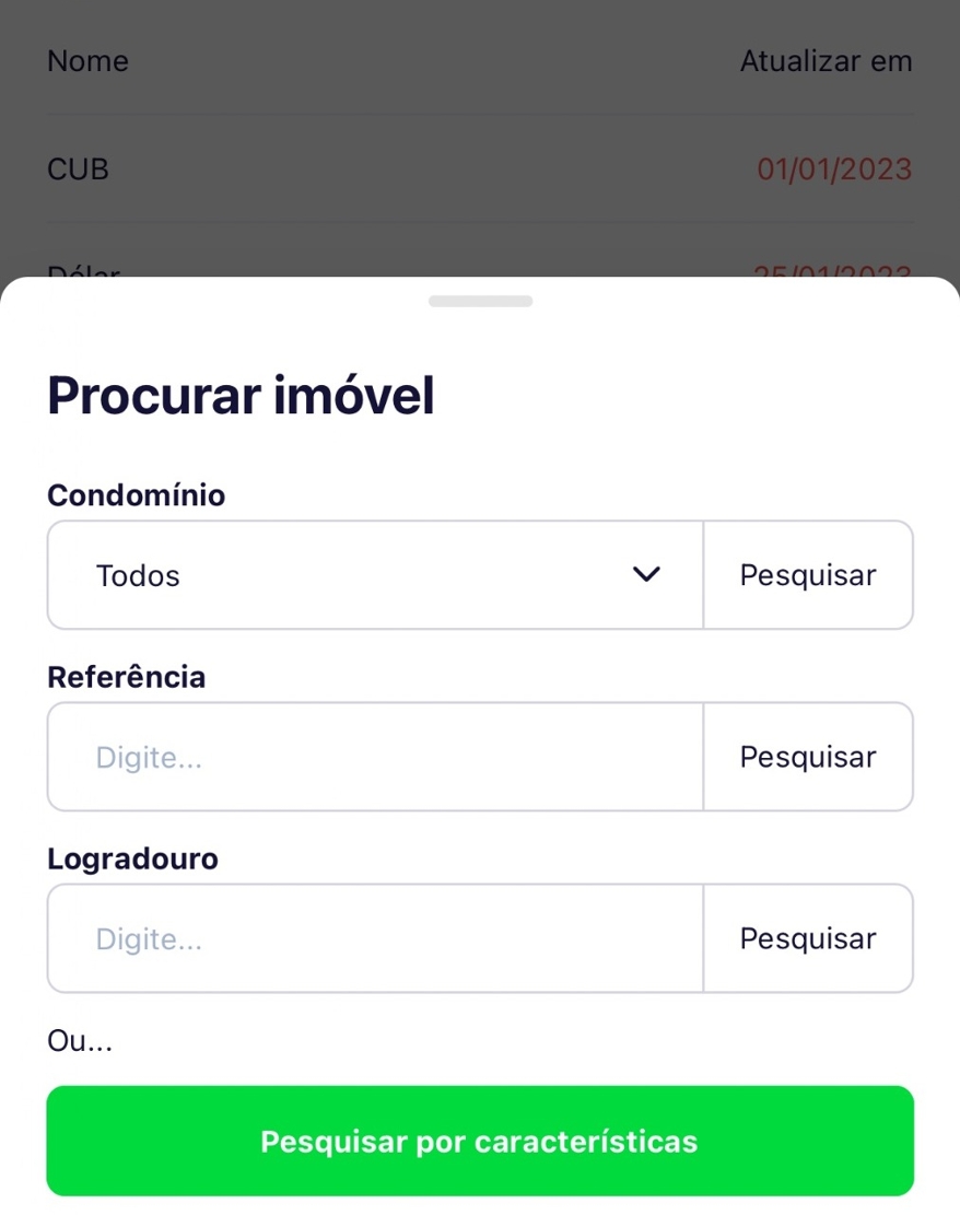 - Pesquise o imóvel por condomínio, código de referência, logradouro ou por características.