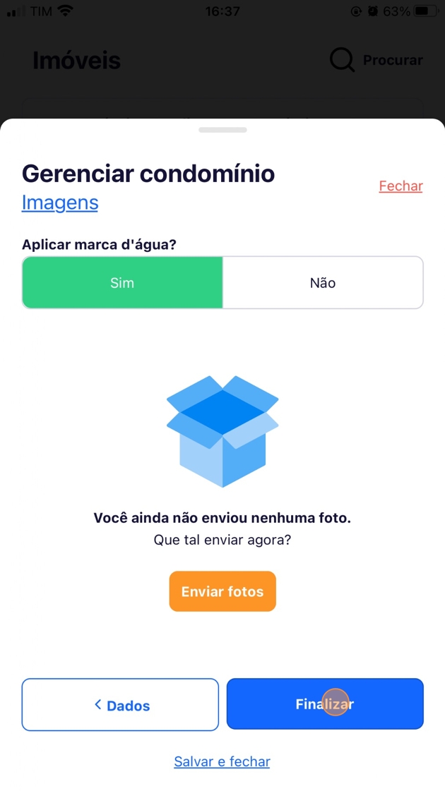 - Clique em "Enviar fotos" para enviar imagens do condomínio/empreendimento e clique em "Finalizar" para concluir o cadastro.