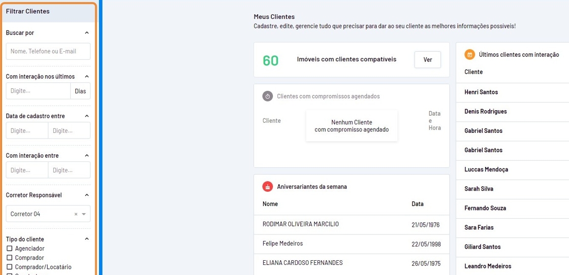 - Utilize o filtro no menu do canto esquerdo da tela para localizar o cliente.