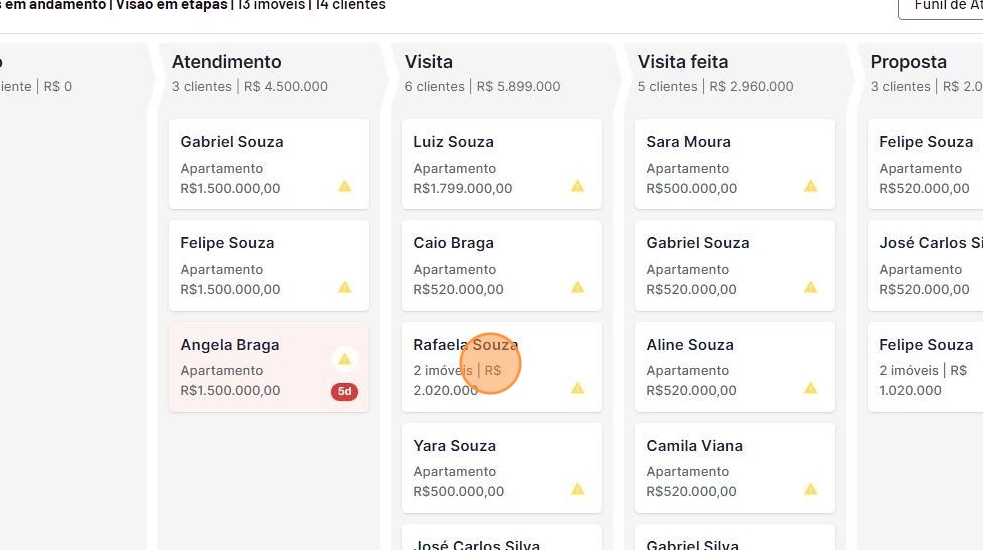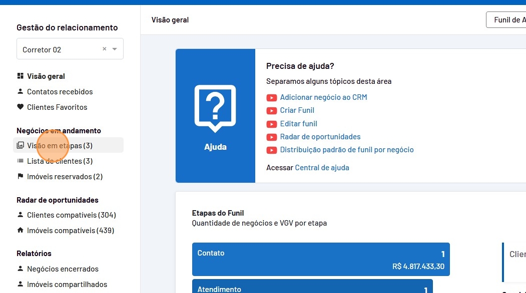 - Clique em "Visão em etapas" para visualizar todas as negociações que estão no CRM.