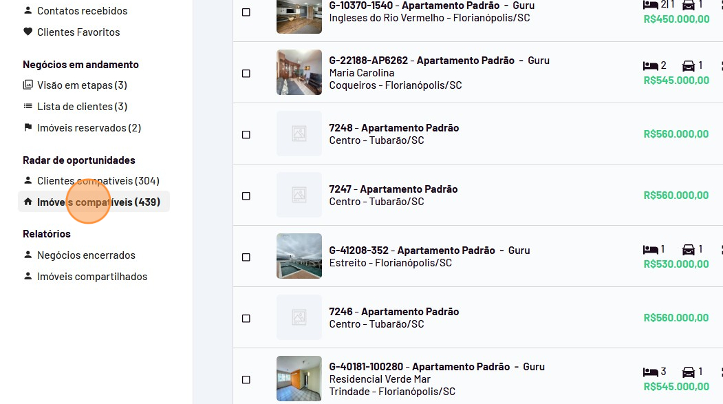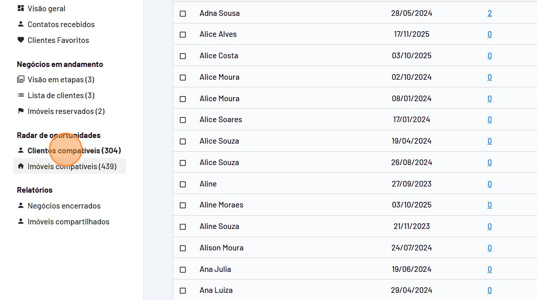 - Na lateral esquerda ficará o Radar de oportunidades, onde você pode visualizar a quantidade de clientes compatíveis e imóveis compatíveis.