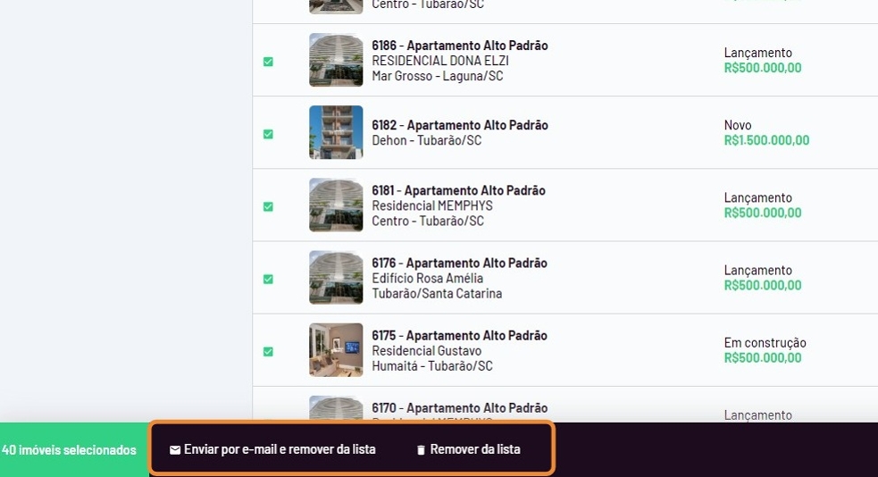 - Você poderá selecionar individualmente ou selecionar todos na caixinha de selação ao lado de "Imóvel".