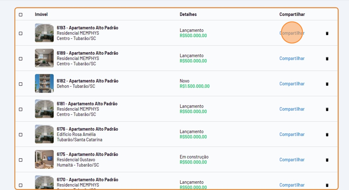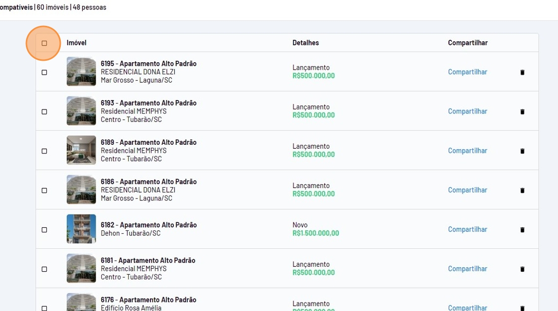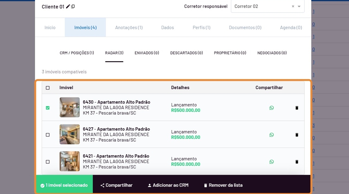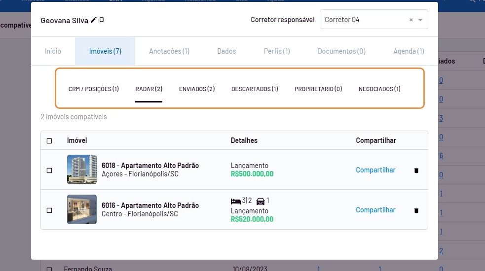 Ao clicar em "Compartilhar" você será direcionado à ficha do imóvel para visualizar os clientes compatíveis com o imóvel selecionado.