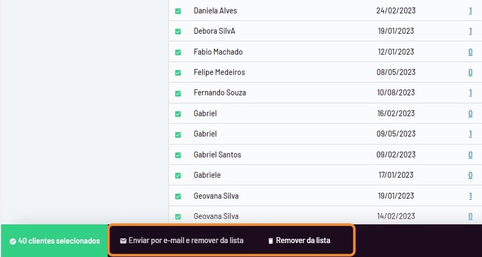 - Você poderá selecionar individualmente ou selecionar todos na caixinha de selação ao lado de "Cliente".