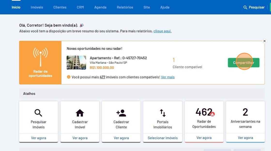 - Para visualizar os imóveis e clientes compatíveis, clique no menu "CRM" ou em "Radar de Oportunidades".