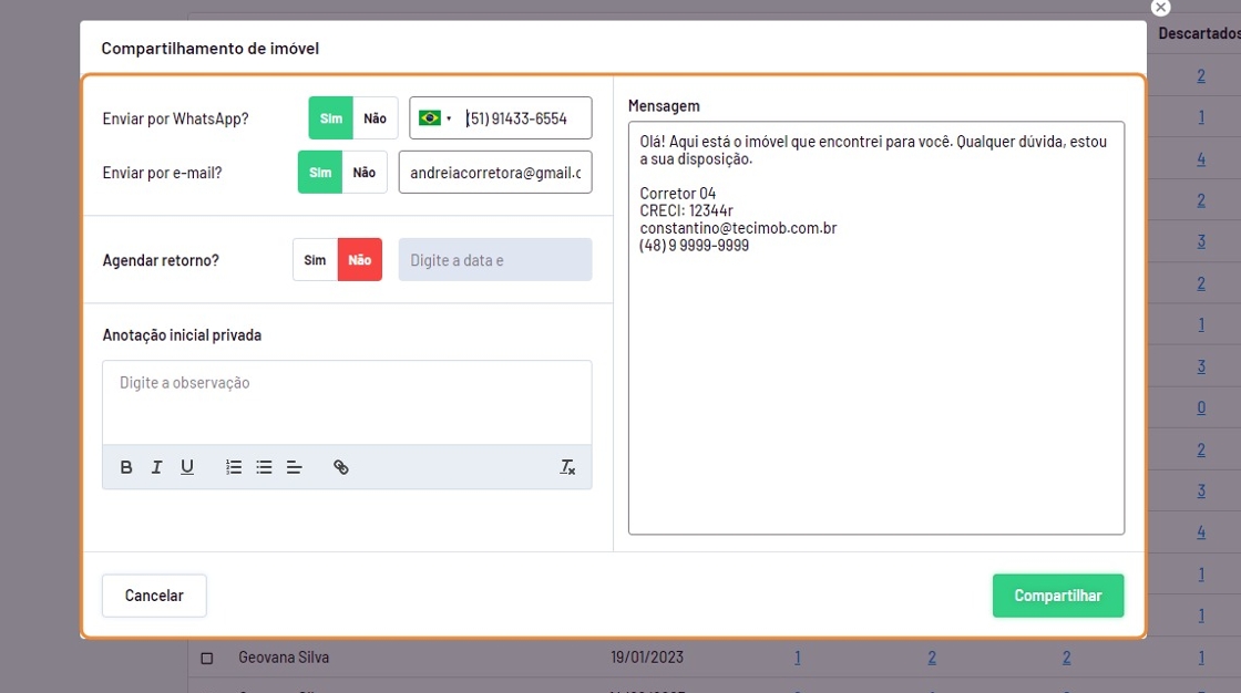 - Ao clicar em "Compartilhar" você poderá enviar os imóveis por Whatsapp ou por E-mail, agendar um retorno, adicionar uma anotação privada e editar a mensagem.