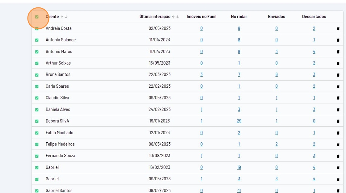 - Nessa lista, você poderá visualizar o "Cliente", a data da "Última interação", a quantidade de "Imóveis no funil" que estão em negociação, quantidade de imóveis que foram encontrados "No radar" (imóveis compatíveis), quantidade de imóveis que foram "Enviados" e "Descartados".