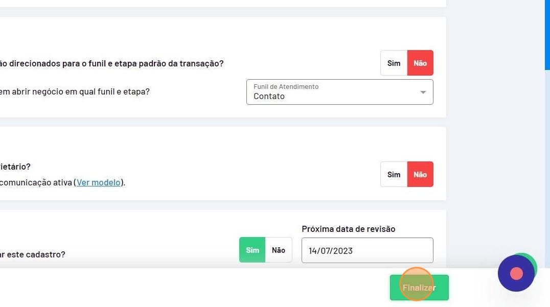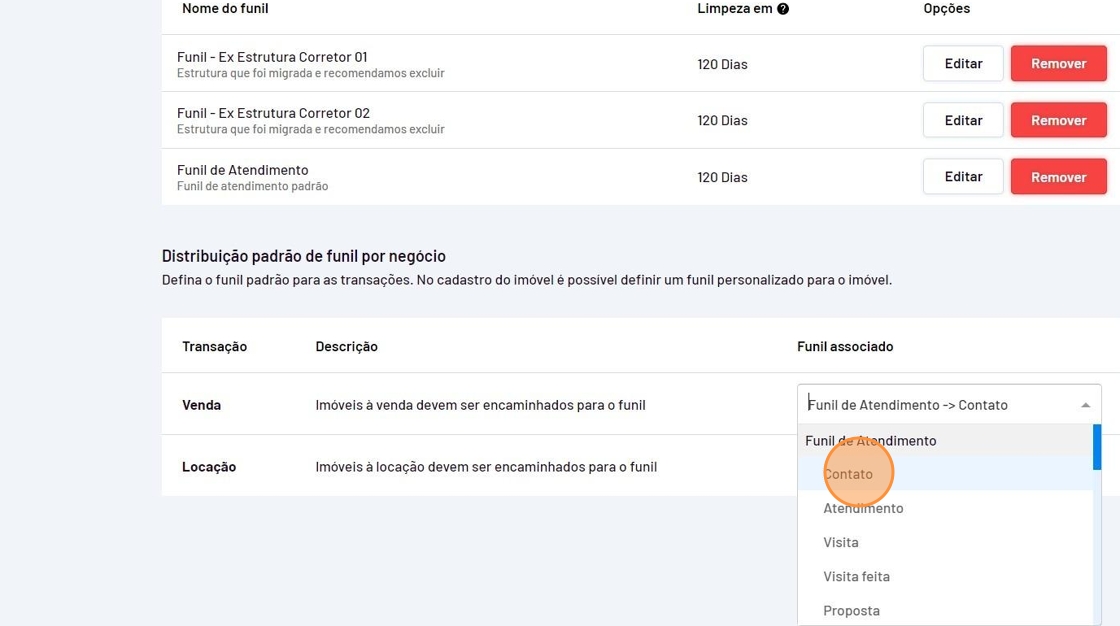 - Abaixo da listagem de Funis, você poderá determinar em qual funil e etapa os clientes que entrarem em contato referente a um imóvel de venda e locação serão encaminhados.