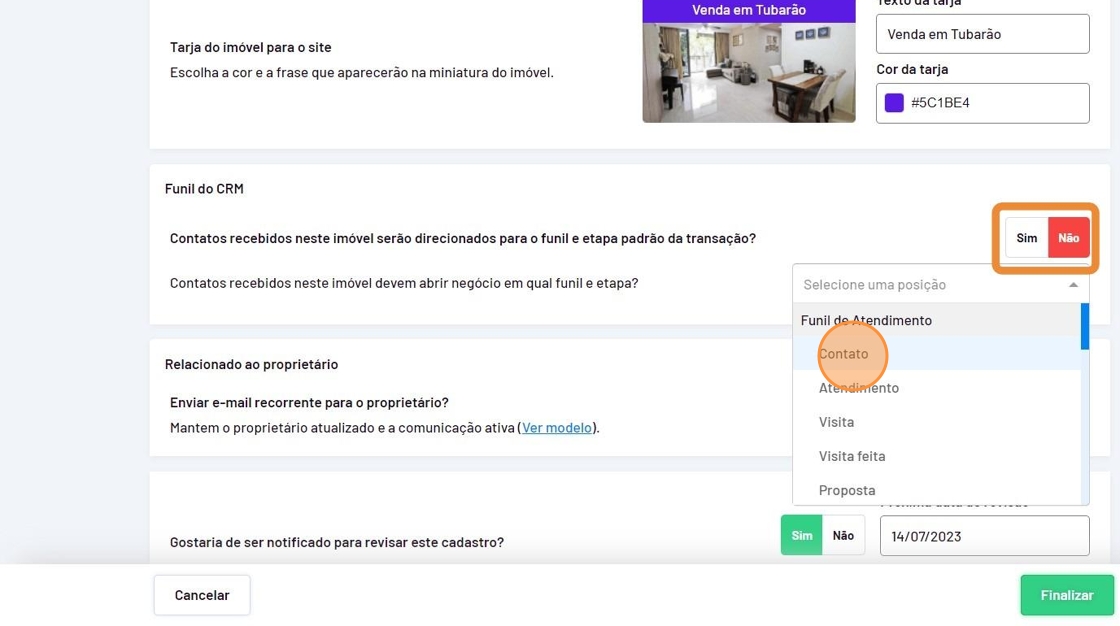 - Em "Funil do CRM", selecione a opção "Não" para os contatos recebidos neste imóvel não serem direcionados para o funil e etapa padrão da transação, e escolha o Funil e etapa desejada.