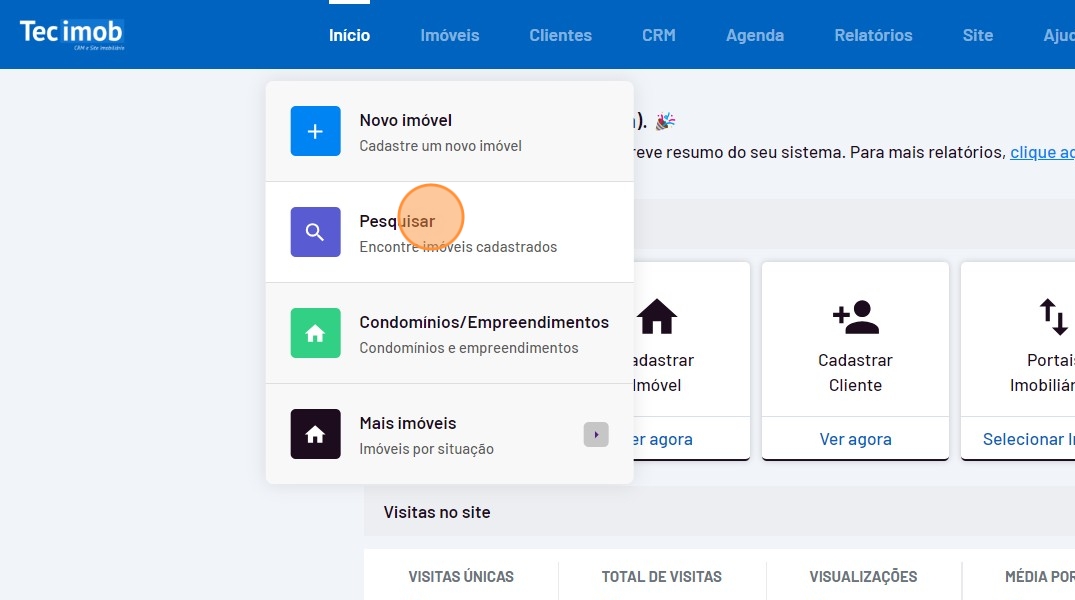 - Para definir para qual funil e etapa um imóvel específico deverá ser encaminhado, vá até o menu "Imóveis" e clique em "Pesquisar".
