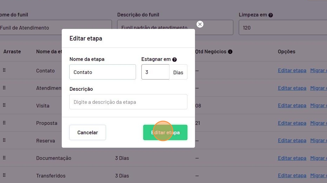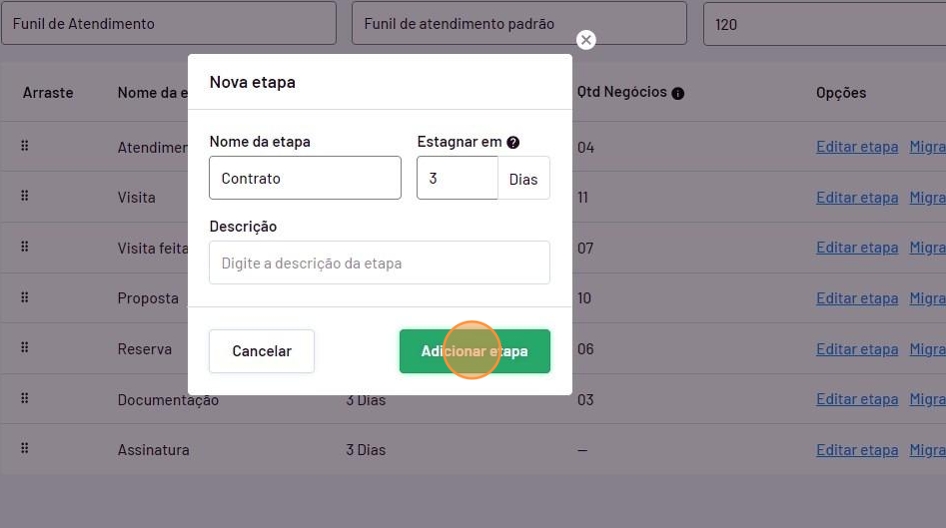 - Preencha as informações como o nome, quantidade de dias o negócio será considerado estagnado e a descrição, ao finalizar clique em "Adicionar etapa".