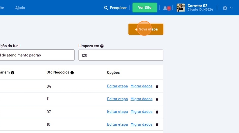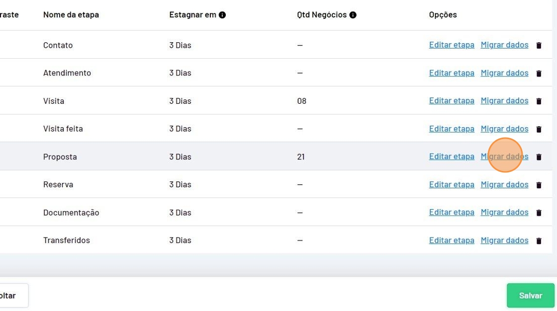 - Para migrar os dados de uma etapa para outra, vá até a etapa desejada e clique em "Migrar dados".