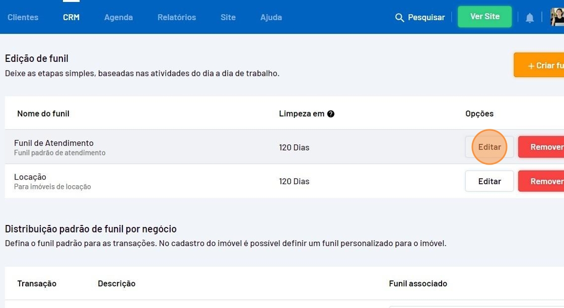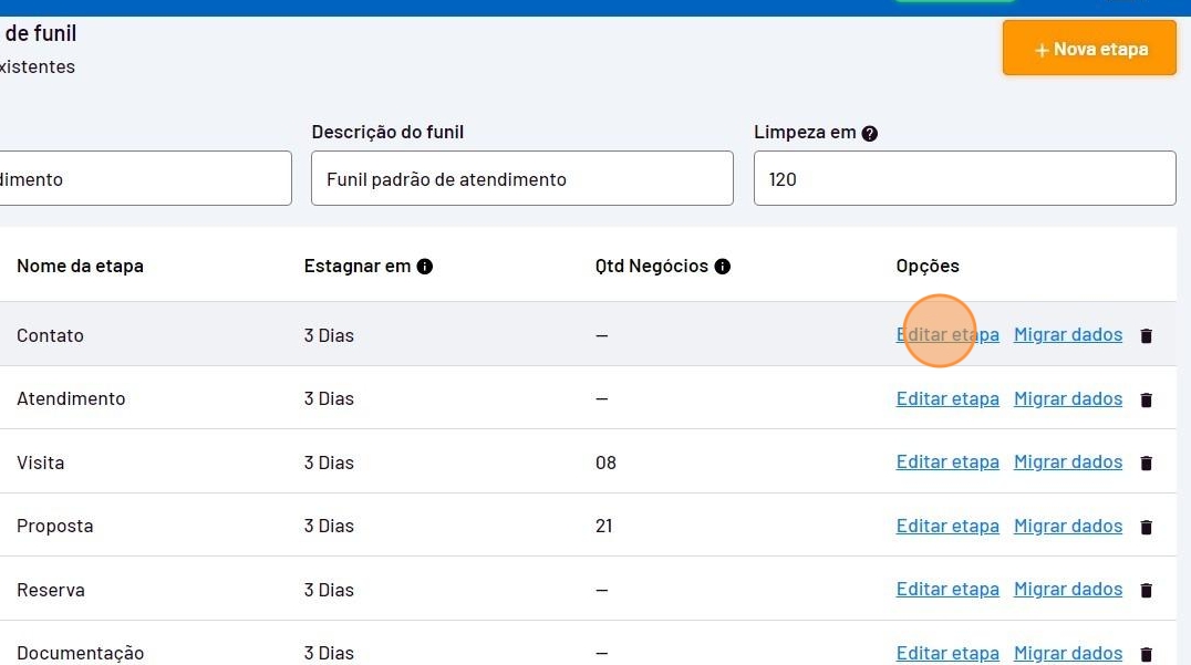 Para editar, migrar dados ou excluir um funil, siga os seguintes passos: