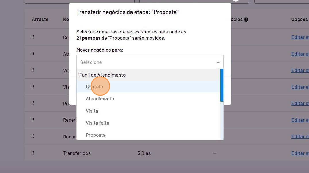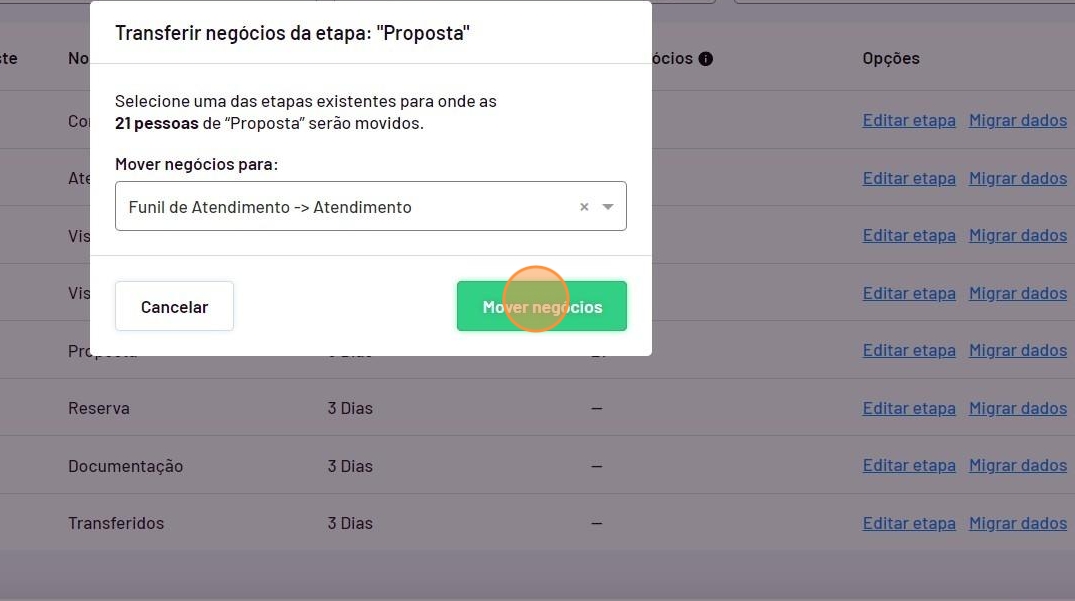 - Selecione para qual funil e etapa deseja mover as negociações.