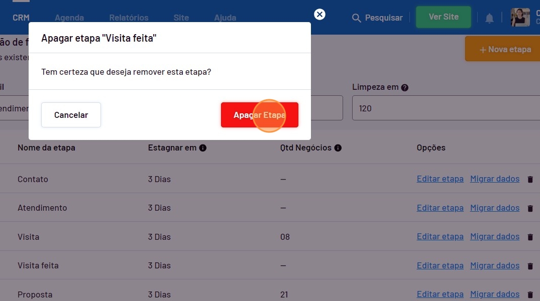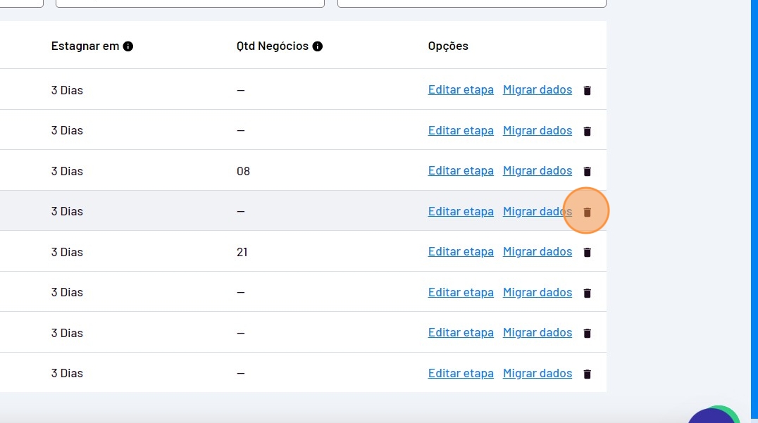 - Para excluir a etapa de um funil, clique na lixeira ao lado de "Migrar dados".