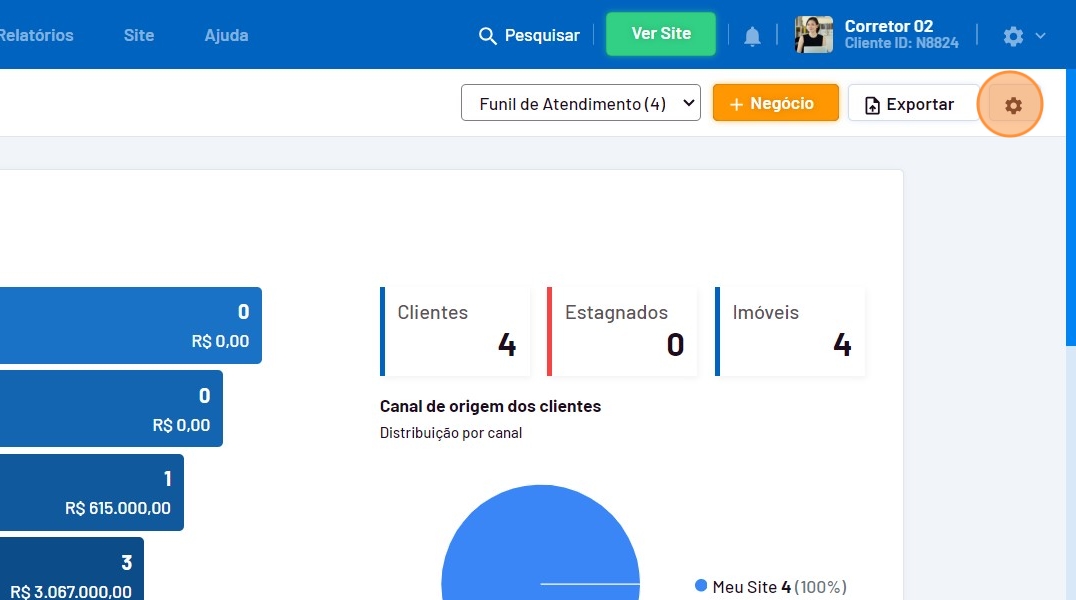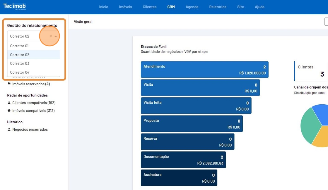 - Para os administradores conseguirem visualizar as negociações de um corretor específico, basta ir em "Gestão de relacionamento" e selecionar o corretor.