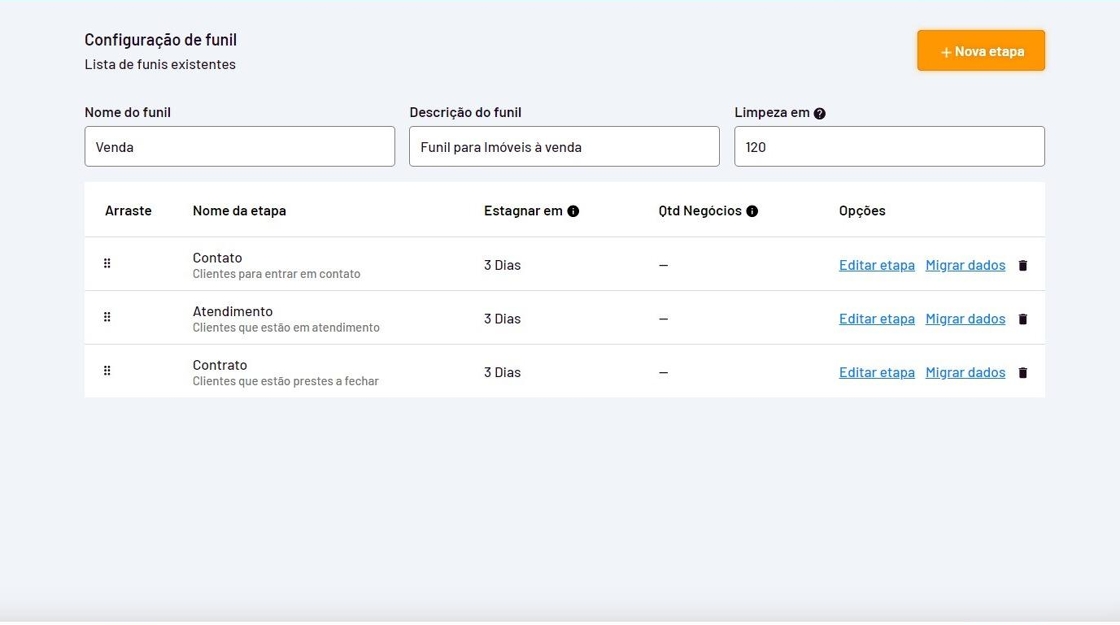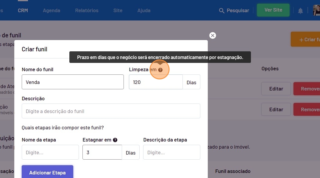 Alert: Se todas as negociações estiverem estagnadas nesse período, o sistema irá limpar para deixar o crm vazio. As negociações poderão ser encontradas em "Negócios encerrados".