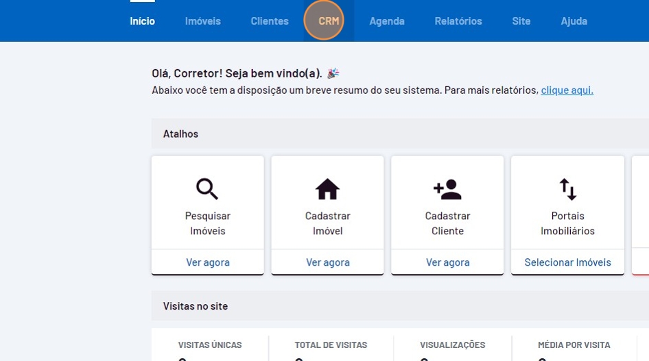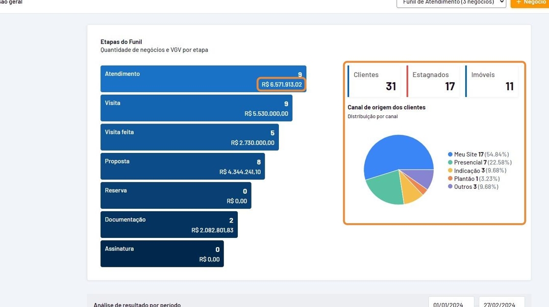 - O administrador conseguirá visualizar os valores somados em cada etapa, a quantidade de clientes no funil, as negociações estagnadas, o número de imóveis no CRM e a Origem dos clientes.