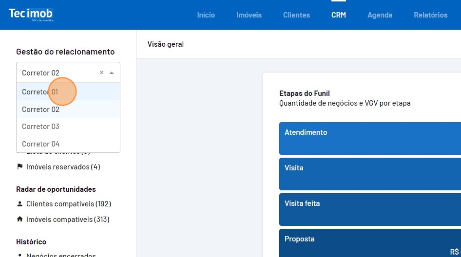 Para visualizar os negócios de um corretor ou de todos ao mesmo tempo, siga estes passos: