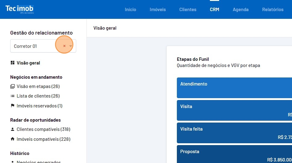 - Caso o administrador queira ter uma visão geral das negociações de todos os corretores, basta clicar no "x" para tirar o corretor selecionado.