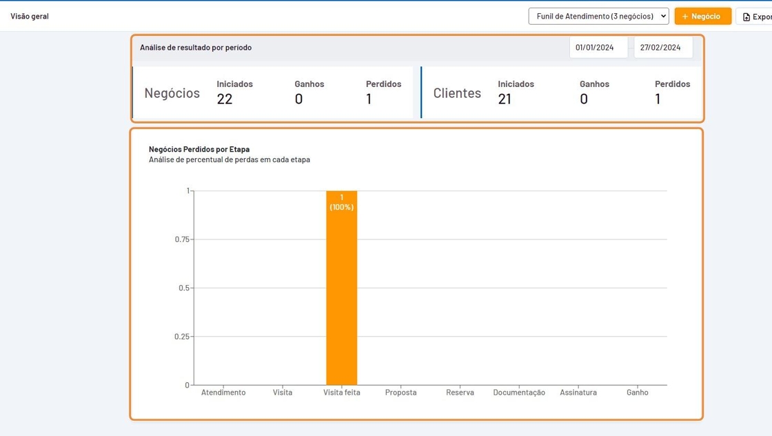 - Também é possível analisar os resultados das negociações e clientes, filtrando por período.
