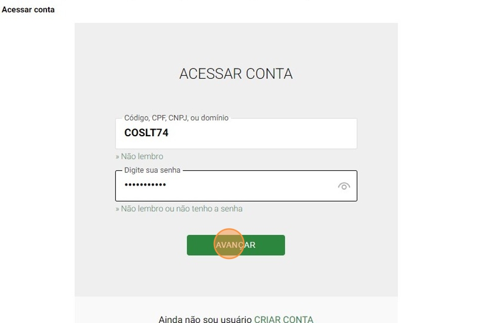 - Acesse seu painel no registro.br, insira os dados de acesso e clique em "Avançar".