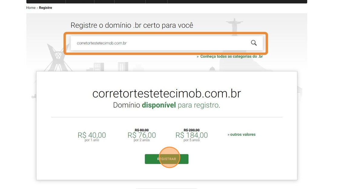- Informe o domínio que deseja e aguarde para verificar se está disponível, se sim, clique em "Registrar".