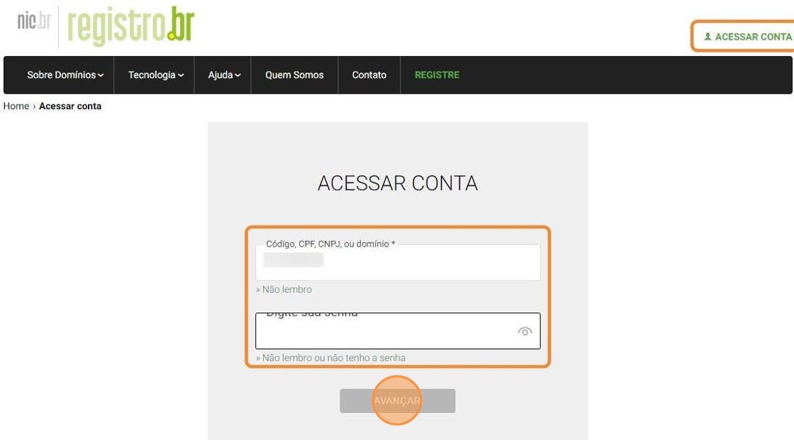 - Acesse seu painel no registro.br, insira os dados de acesso e clique em "Avançar".