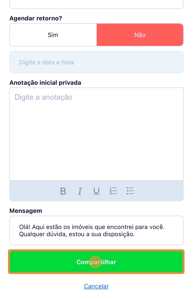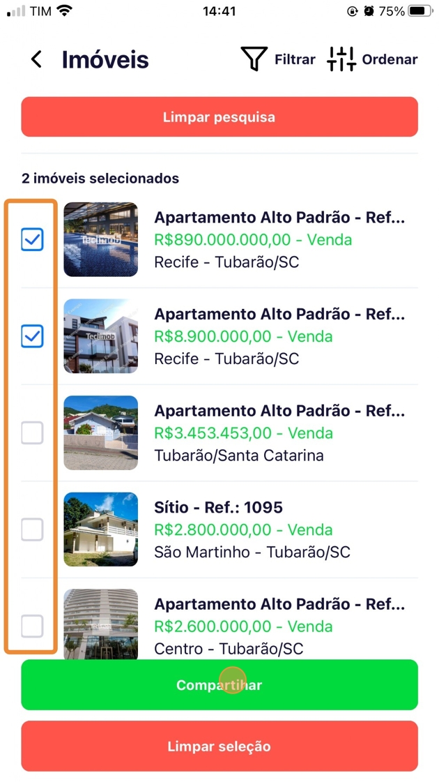 - Após encontrar os imóveis, selecione-os na caixinha de seleção e clique em "Compartilhar".