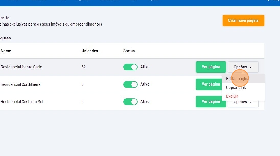- Vá até o empreendimento, passe o mouse em "Opções" e clique em "Editar página".