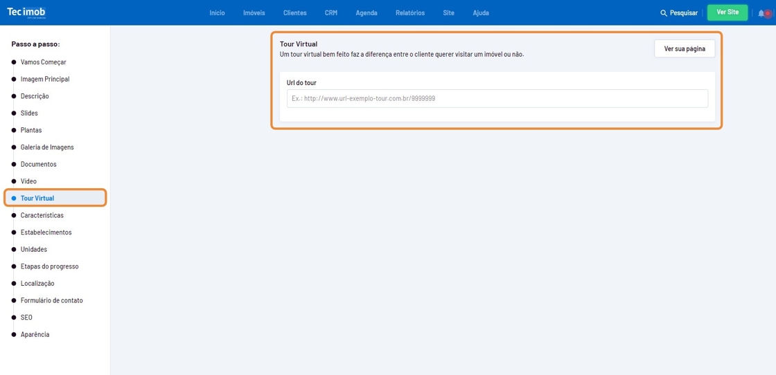 (O tour virtual deve ser realizado por uma empresa que tenha suporte ao sistema do Tecimob, como por exemplo a Roundme).