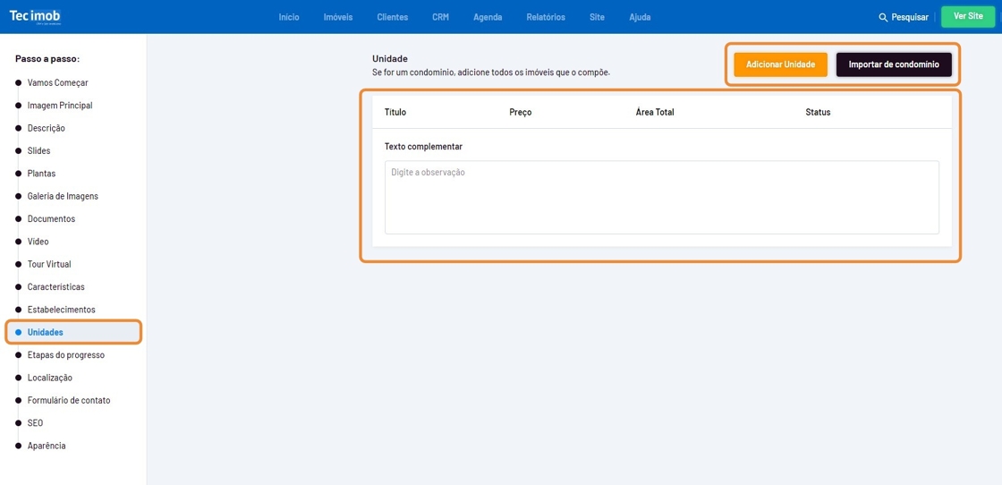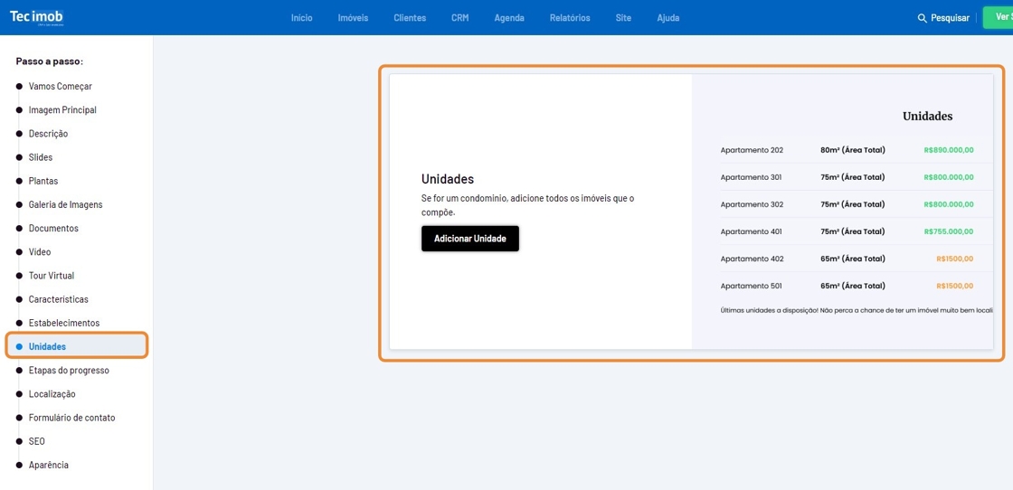 - Adicione imóveis de um condomínio ou condomínios/empreendimentos que já foram cadastrados no sistema clicando em "Adicionar Unidade".