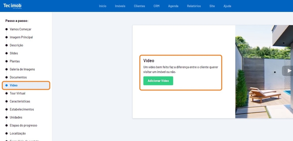 (O vídeo precisa estar no Youtube e em Modo Público. O Tecimob não se responsabiliza por remoções do vídeo ou por solicitações de retirada do vídeo do Hotsite por direitos autoriais).