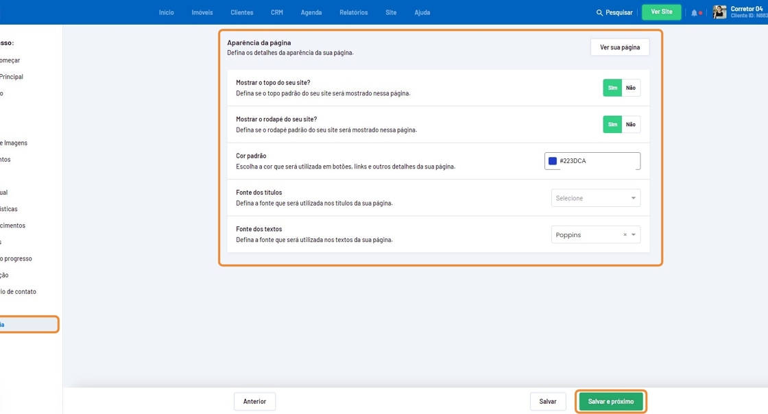 - Defina as opções de aparência, cor padrão e fontes do Hotsite.