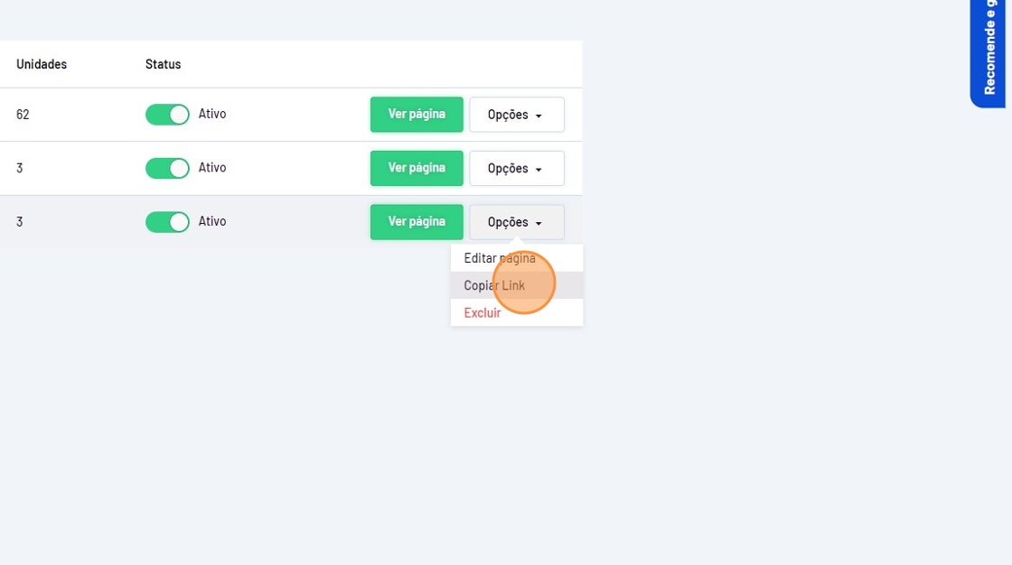 - Passe o mouse em "Opções" e clique em "Copiar Link" para utilizar seu Hotsite.