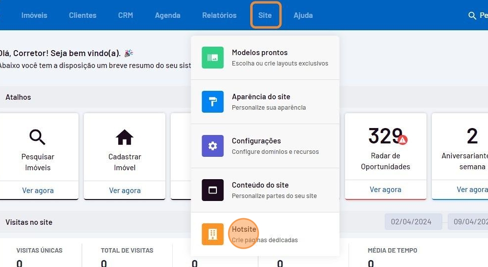 - Vá até o menu "Site" e clique em "Hotsite".